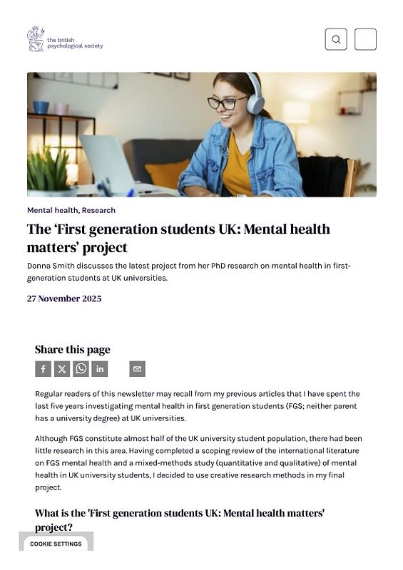 Smith, Donna. “The 'First Generation Students UK: Mental Health Matters' Project.” British Psychological Society, 28 November 2025 (n.d.).